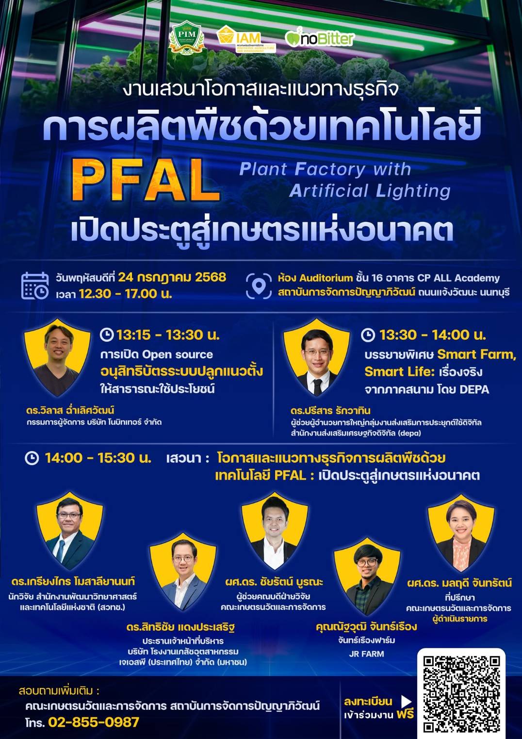 ข่าวประชาสัมพันธ์ งานเสวนาโอกาสและแนวทางธุรกิจ การผลิตพืชด้วยเทคโนโลยี ในวันพฤหัสบดีที่ 24 กรกฎาคม 2568 เวลา 12.30 – 17.00 น. ณ สถาบันการจัดการปัญญาภิวัฒน์ ถนนแจ้งวัฒนะ นนทบุรี