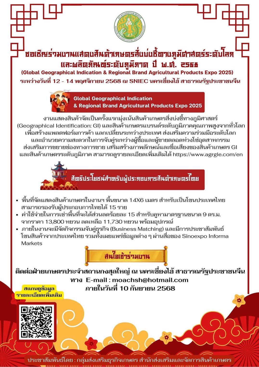 เชิญร่วมงานแสดงสินค้าเกษตรสิ่งบ่งชี้ภูมิศาสตร์ระดับโลก และผลิตภัณฑ์ระดับภูมิภาค ปี พ. ศ. 2568