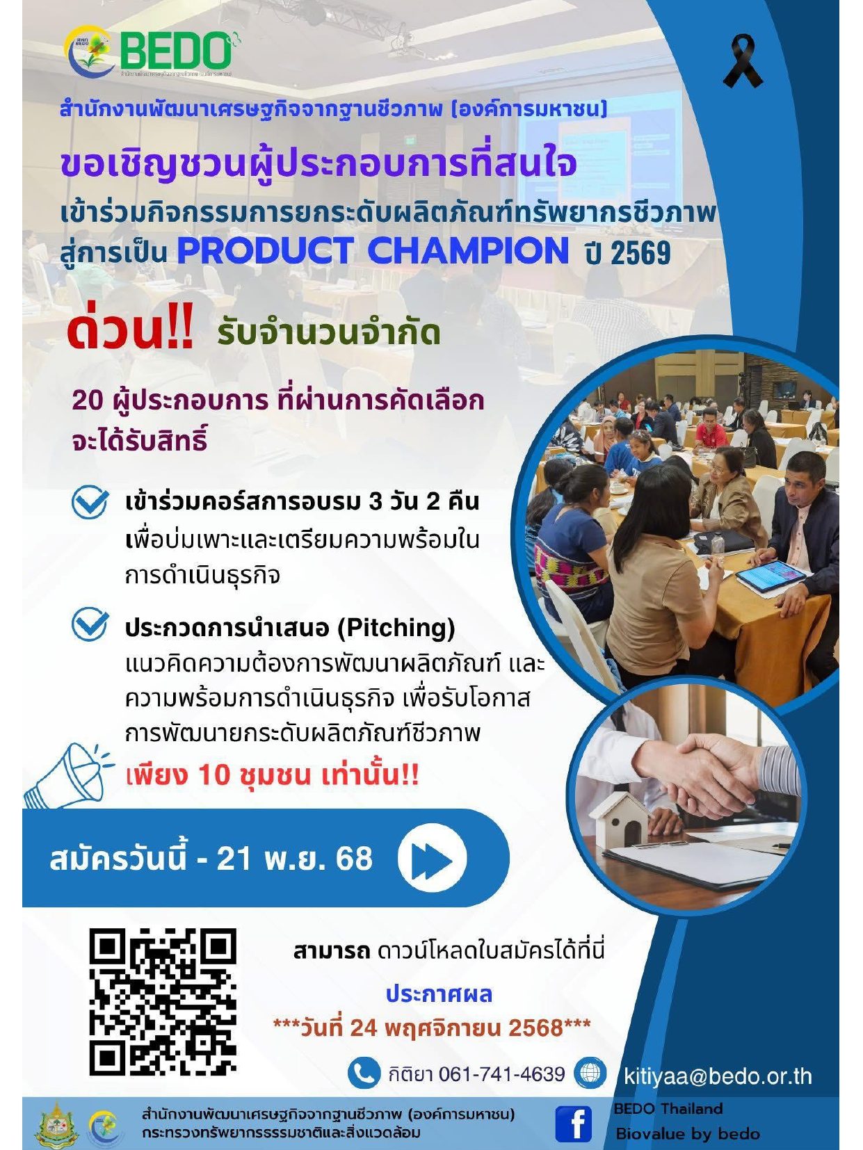 ขอเชิญวิสาหกิจชุมชนเข้าร่วมสมัครเข้าร่วมกิจกรรมการพัฒนาแนวคิดการผลิตภัณฑ์เพื่อคัดเลือกเข้าสู่โครงการ”การยกระดับผลิตภัณฑ์ทรัพยากรชีวภาพสู่การเป็น Product Champion 2569″