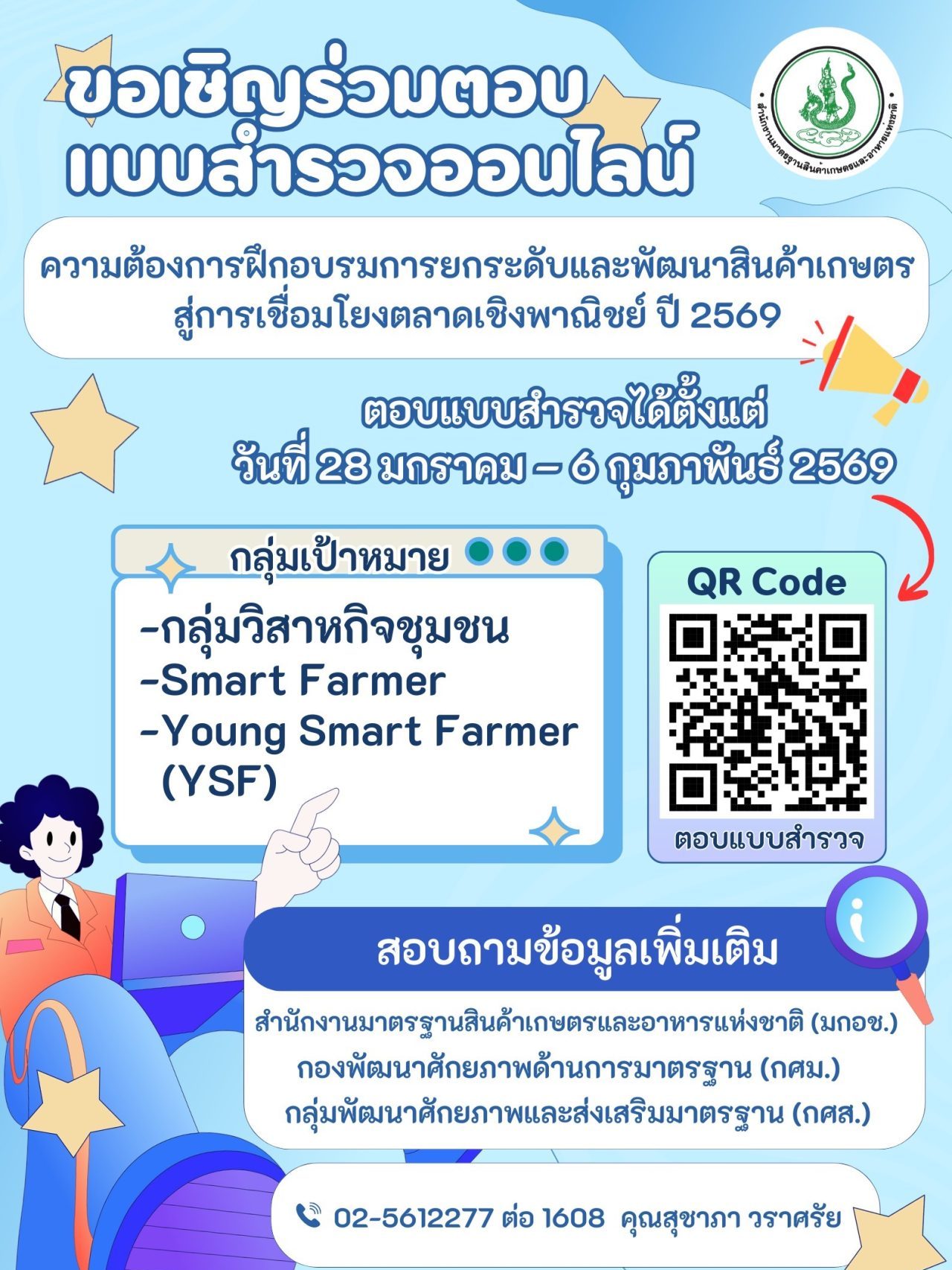 ขอเชิญร่วมตอบแบบสำรวจความต้องการฝึกอบรมเชิงปฏิบัติการแนวทางยกระดับและพัฒนาสินค้าเกษตรสู่การเชื่อมโยงตลาดเชิงพาณิชย์