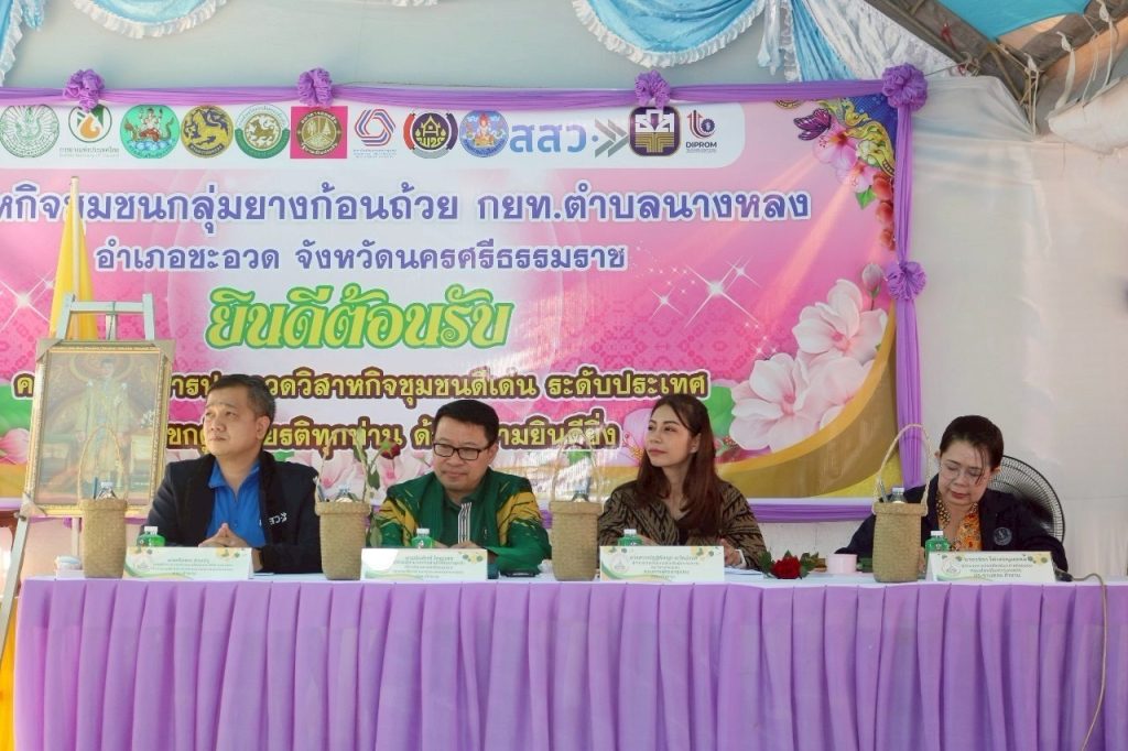 คณะทำงานประกวดวิสาหกิจชุมชนดีเด่น ระดับประเทศ โดยมีนางวชิรา ไฝเจริญมงคล ผู้อำนวยการกองส่งเสริมวิสาหกิจชุมชน ประธานคณะทำงานฯ พร้อมด้วยคณะทำงาน ซึ่งเป็นผู้แทนจากหน่วยงาน ประกอบด้วย กรมตรวจบัญชีสหกรณ์ สำนักงานส่งเสริมวิสาหกิจขนาดกลางและขนาดย่อม ธนาคารเพื่อการเกษตรและสหกรณ์การเกษตร และกรมส่งเสริมอุตสาหกรรม ได้ลงพื้นที่ประกวดวิสาหกิจชุมชนดีเด่น ระดับประเทศ ปี 2568 ณ วิสาหกิจชุมชนยางก้อนถ้วย กยท. ตำบลนางหลง อำเภอชะอวด จังหวัดนครศรีธรรมราช ซึ่งเป็นวิสาหกิจชุมชนที่มีการผลิตยางก้อนถ้วย ภายใต้มาตรฐาน EUDR โดยเป็นการผลิตที่ไม่มีการบุกรุกพื้นที่ป่า และสามารถตรวจสอบย้อนกลับได้ ทั้งนี้ ยังมีการรวบรวมผลผลิตจากสมาชิกและจำหน่ายผ่านระบบการประมูล ส่งผลให้สมาชิกมีรายได้เพิ่มมากขึ้น นอกจากนี้ ยังมีการส่งเสริมการปลูกพืชแซมสวนยาง เพื่อลดพื้นที่การปลูกพืชเชิงเดี่ยว และสร้างรายได้อีกช่องทางให้สมาชิก โดยวิสาหกิจชุมชนได้นำเสนอผลงานและการบริหารจัดการต่อคณะทำงานฯ #ประกวดวิสาหกิจชุมชนดีเด่น2568xนครศรีธรรมราช