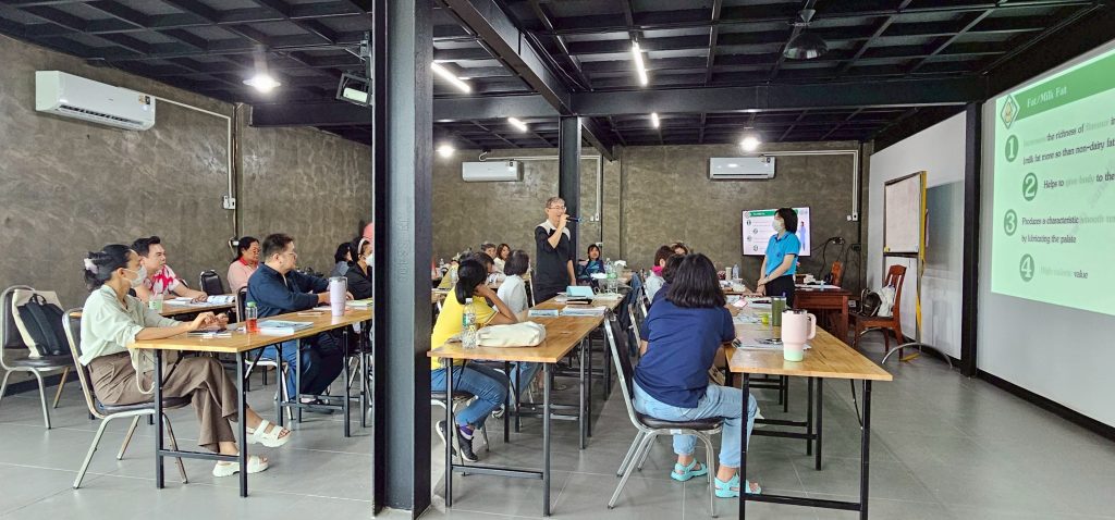 กองส่งเสริมวิสาหกิจชุมชนมอบหมายให้ น.ส. สุพิชา วัฒนปรีชานนท์ นักวิชาการส่งเสริมการเกษตรชำนาญการ เป็นวิทยากรการฝึกอบรมหลักสูตรการทำไอศกรีมจากผลไม้สด ผลิตภัณฑ์นมและโยเกิร์ต และการเสริมสร้างการเป็นผู้ประกอบการ เพื่อสร้างความเข้มแข็งแก่ธุรกิจชุมชนตามแนวพระราชดำริ รุ่นที่ 2 ประจำปีงบประมาณ พ.ศ. 2568 ณ โรงเรียนลูกพระดาบส มูลนิธิพระดาบส จ.สมุทรปราการ ให้กับผู้เข้ารับการฝึกอบรมฯ จำนวน 30 คน
