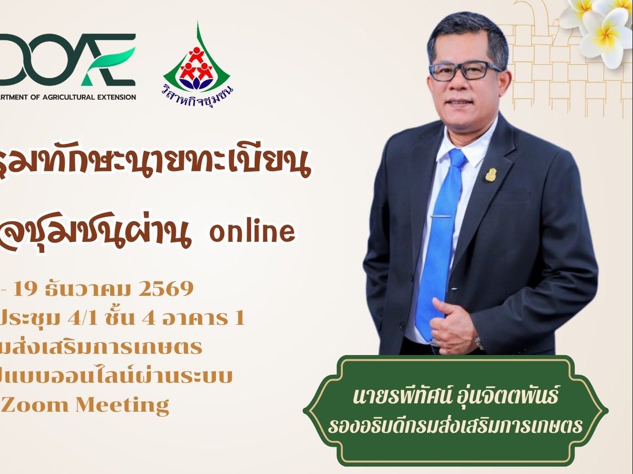 วันที่ 18 ธันวาคม 2568นายรพีทัศน์ อุ่นจิตตพันธ์ รองอธิบดีกรมส่งเสริมการเกษตร เป็นประธานเปิดการอบรมนายทะเบียนวิสาหกิจชุมชนผ่าน online โดยมีนางวชิรา ไฝเจริญมงคล ผู้เชี่ยวชาญด้านส่งเสริมวิสาหกิจชุมชน ปฏิบัติหน้าที่ผู้อำนวยการกองส่งเสริมวิสาหกิจชุมชน กล่าวรายงาน ซึ่งการอบรมดังกล่าวมีวัตถุประสงค์เพื่อสร้างความรู้ ความเข้าใจ ในการดำเนินงานด้านทะเบียนวิสาหกิจชุมชน แนวทางการให้คำแนะนำวิสาหกิจชุมชนในการจดทะเบียนจัดตั้งนิติบุคคล ภาษีที่เกี่ยวข้องกับวิสาหกิจชุมชน การบริหารจัดการด้านการเงิน พระราชบัญญัติคุ้มครองข้อมูลส่วนบุคคล พ.ศ. 2562 ให้กับนายทะเบียนวิสาหกิจชุมชน ผู้รับผิดชอบงาน และเจ้าหน้าที่ผู้เกี่ยวข้อง สามารถให้คำแนะนำและแก้ปัญหาในการดำเนินงานด้านทะเบียนวิสาหกิจชุมชนในพื้นที่ได้ รวมถึงพัฒนาส่งเสริมสนับสนุนวิสาหกิจชุมชนไปสู่การเป็นผู้ประกอบการเกษตร และธุรกิจวิสาหกิจชุมชนที่มีความเข้มแข็ง